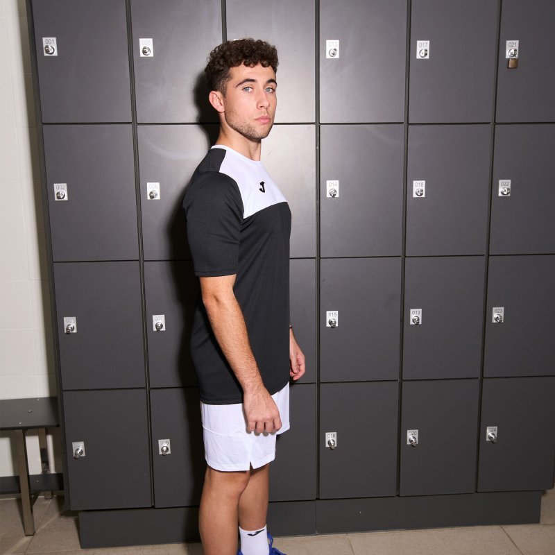 Short-sleeved T-shirt with a round collar and contrasting colour yoke at the front. Stands out due to its design, with forward shoulder seam and embroidered logo.